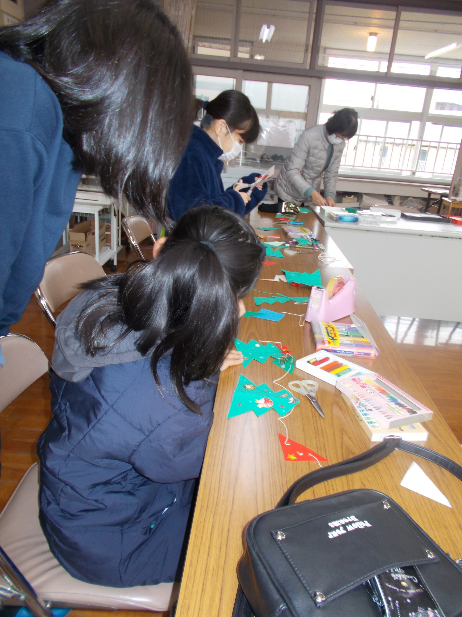 クリスマスのかざりを作ろう 子どもたちはクリスマスが大好きです。今回はクリスマスの壁飾りを作りました。ツリーの形、三角や四角の形のいろ紙をタコ糸でつなぎました。いろ紙には絵や文字をかいたり、クリスマスのシールをはったりしました。完成した飾りを持って写真をパチリ。プレゼントをもらって帰りました。ボランティア中学生の活躍、保護者方々の参加など、皆さまありがとうございました。来年もよろしくお願いいたします。