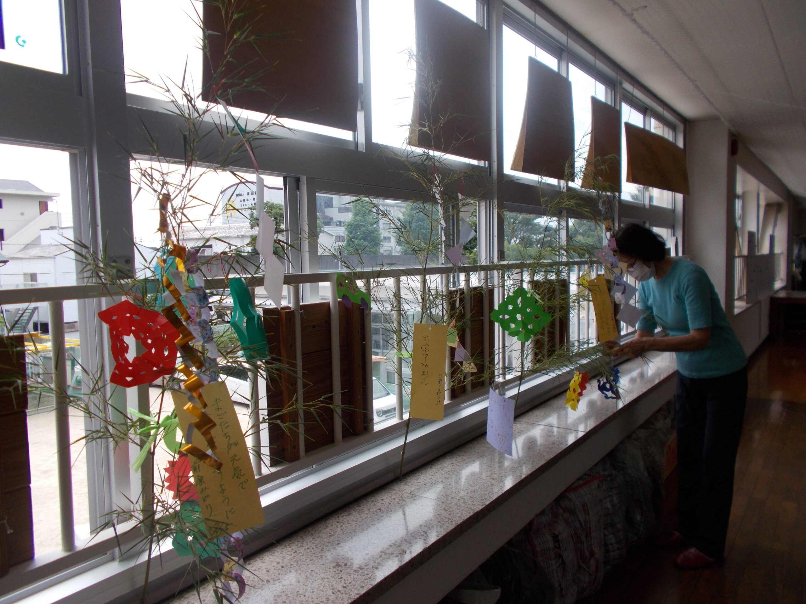 7月15日は「七夕飾りをつくろう」でした。坪田譲治作「子供十二ヵ月」の中で、7月は七夕の思い出を書いています。そのことから、子どもの館でも毎年七夕飾りを作って、笹につけて持って帰ります。今年は、涼しげな若竹に願い事を書いた短冊や、折り紙で作った飾り、輪つなぎなどを飾りました。お孫さんと一緒に参加された方は、「七夕飾りを作ったのは何十年ぶりだろう」と言いながら、たくさんの飾りを作っていました。できた飾りを見て、スタッフも幸せな気持ちになりました。8月は、9月が防災月間であることから「身近にある新聞紙で、困ったときに使えるスリッパを折ってみよう」という活動を考えています。皆様の参加をお待ちしています。
